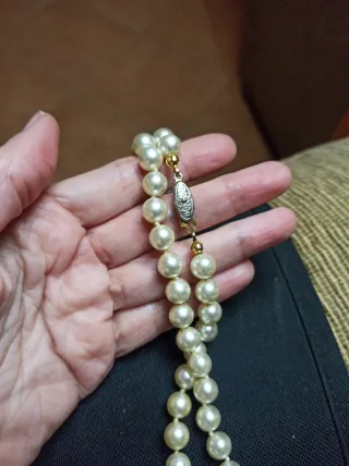 Elegante collar de perlas con un diseño clásico. - Perlas de tono grisáceo. - Cierre metálico con un diseño floral. Collares de perlas de (madreperla) – NUEVOS Procedentes de una antigua fábrica de bisutería en Mallorca que cerró sus puertas. Son piezas nuevas, nunca usadas, con un diseño elegante y clásico. 🔹 Material: Perlas de imitación en nácar (madreperla) 🔹 Estado: Nuevos 🔹 Estilo: Atemporal, ideal para dar un toque sofisticado a cualquier look 🔹 Perfectos como detalle especial o complemento de fiesta Disponibles varias unidades. Entrega en mano en Mallorca o envío a toda España.
