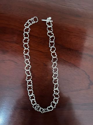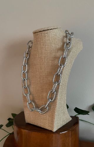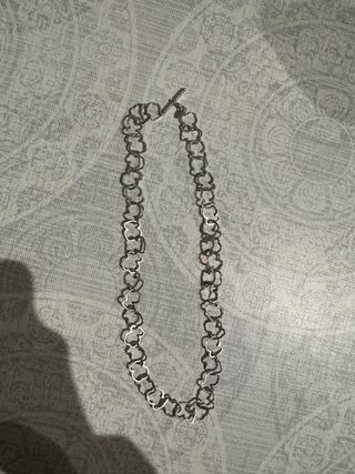 Collar con un diseño de cadena de eslabones gruesos. Su acabado plateado le da un toque moderno y llamativo. - Eslabones grandes y texturizados. - Cierre de mosquetón.