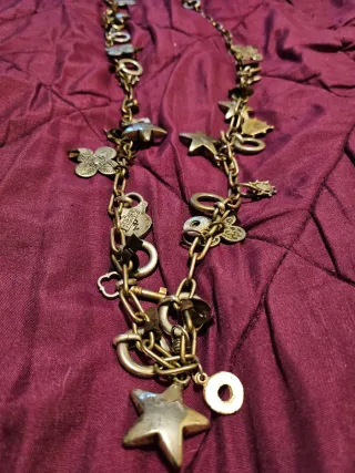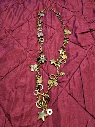 Collar de bisutería con un diseño encantador y detalles únicos. - Cadena dorada con múltiples dijes. - Dijes variados: estrellas, flores y candados. - Estilo bohemio y llamativo.