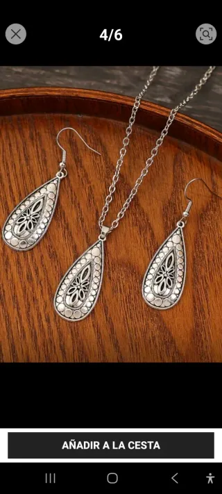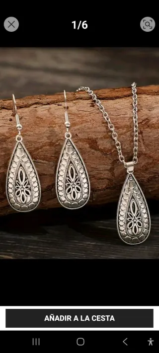 Conjunto de collar y pendientes con un diseño detallado. - Acabado plateado. - Diseño tipo lágrima con motivos florales.