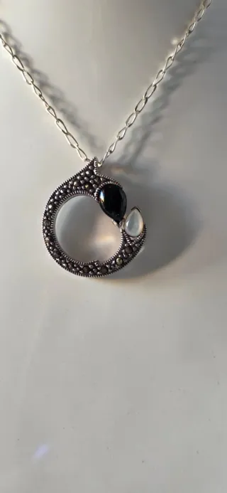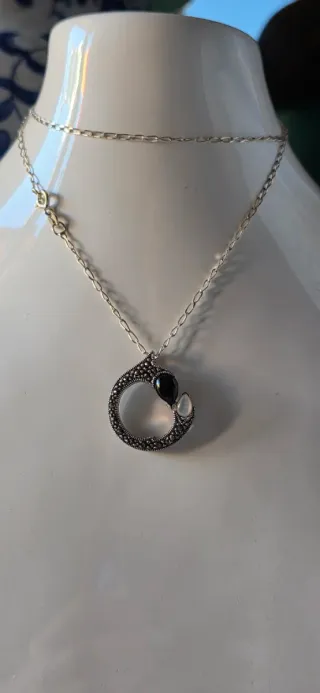 Elegante collar con un diseño de serpiente enroscada. La pieza central combina la profundidad del ónix con el brillo sutil del nácar. - Colgante con forma de serpiente. - Detalles en ónix y nácar. - Cadena de plata.