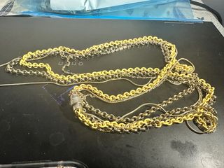 Elegante collar de la marca Nereides con un diseño de cadenas entrelazadas. - Combinación de eslabones plateados y amarillos. - Cierre de seguridad.