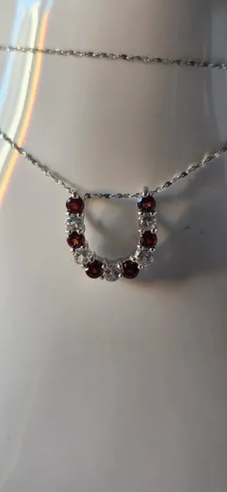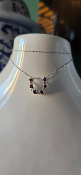 Elegante collar con colgante en forma de herradura. Una pieza delicada que aporta un toque de distinción. - Colgante con diseño de herradura. - Engastado con granates y circonitas. - Cadena fina de plata. 🌍POR FAVOR CUALQUIER DUDA PREGUNTA 🌍TENEMOS PRECIOS FIJOS (LEER) 🌍TAMBIEN ENTREGAMOS EN MANO 🌍NO RESERVAMOS . 🌍ESTO ES NUESTRO NEGOCIO .NO UN CAPRICHO 💖 LA FOTO REFLEJA EXACTAMENTE LA.PIEZA