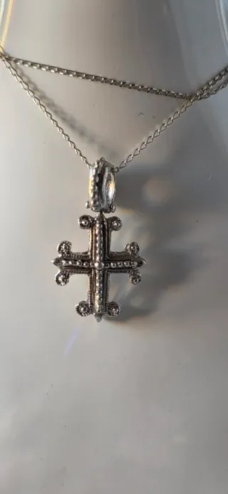 Elegante collar con un colgante en forma de cruz. La cadena y colgante son de color plateado. 1 cadena 5€,las 3 por 12€ -Cadena de eslabones.