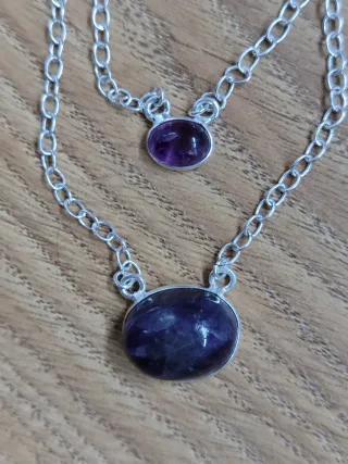 Elegante collar doble con piedras naturales de amatista y fluorita engarzadas en plata. - Cadena fina de plata. - Colgante principal con amatista. - Colgante secundario con fluorita.
