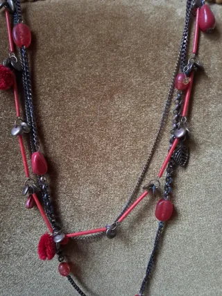 Elegante collar largo con un diseño de múltiples cadenas y detalles llamativos. - Cuentas de resina en color rojo vibrante. - Colgantes metálicos en tono plateado. - Elementos decorativos tipo pompón en rojo. - Diseño de cadena doble con eslabones finos.
