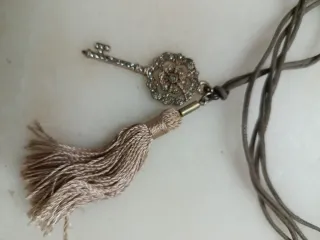 Elegante collar con un colgante de llave adornado con pedrería y una borla. - Colgante de llave con detalles. - Borla de hilo. - Cordón para llevar. - Combinación de colores plata y beige.