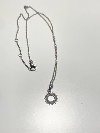 Elegante collar con un colgante circular con diseño de rayos y una pequeña piedra en el centro que aporta un toque luminoso y delicado. La cadena es fina y ajustable (45cm) - Colgante con diseño de sol. - Piedra central. - Cierre de mosquetón. - Marcado 925 en el cierre. Su estilo minimalista y moderno lo hace perfecto para llevar a diario o para combinar con otros collares en looks de capas. Es una pieza versátil que combina fácilmente con cualquier outfit.