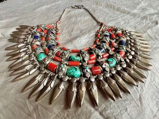 Impresionante collar étnico tibetano con partes de plata, turquesas, coral y lapislázuli. No lleva contraste por eso fue testado en joyería. Principio de siglo XX Manufactura en el estílo específico de la población tibetana de la región Ladakh (Kashmir); Las mujeres Ladakh acostumbran llevar colares imponentes (como amuletos protectores y de adorno). Asimismo las piedras de los collares juegan un papel muy importante en la cultura Ladakh, las más utilizadas siendo la turquesa, el coral, el ámbar y el lapislázulis. Mide unos 41 cm de circunferencia; La parte central : 23 x 7 cm Pesa unos 200 gr. Excelente estado! Coleccionable