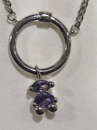 Collar de la marca Tous con un diseño de oso. - Colgante con forma de oso. - Detalles en piedras moradas. - Cadena plateada
