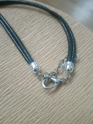 Collar con doble cordón de cuero negro y detalles plateados. - Cierre de mosquetón. - Cadena de extensión para ajustar la medida.
