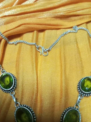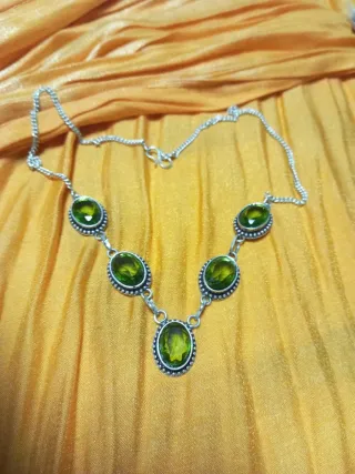 Elegante collar de plata con un diseño delicado y piedras de un vibrante color verde. - Cadena de plata. - Cinco piedras ovaladas engarzadas. - Detalle de borde en cada piedra.