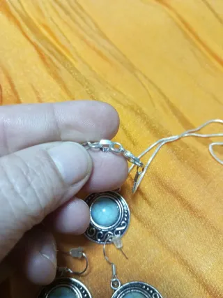 Elegante conjunto de joyería que incluye un collar y un par de pendientes. - Diseño con piedra turquesa. - Cadena de plata. - Pendientes a juego.