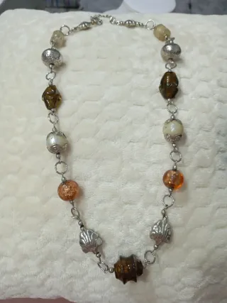 Elegante collar con una variedad de cuentas y detalles metálicos. - Cuentas de cristal en tonos ámbar y perla. - Elementos decorativos en forma de concha. - Cadena de eslabones plateados.