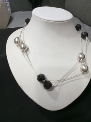Elegante collar para mujer con un diseño moderno y sofisticado. - Combina esferas plateadas y cuentas negras facetadas. - Montado sobre finos hilos plateados.