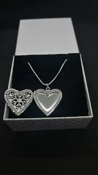 Collar con colgante en forma de corazón, ideal para guardar fotos. Elaborado en plata de ley 925. - Diseño calado con detalles. - Cadena fina. - Cierre de mosquetón.