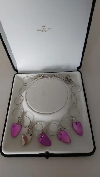 Elegante collar de la marca Paladio, con un diseño delicado y moderno. - Cadena de plata con eslabones. - Colgantes en forma de corazón. - Detalles en color rosa y plata.