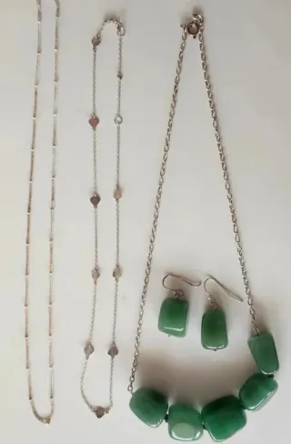 Collar plata de ley con chapitas en forma de corazones 10 euros Collar con colgante de tres circonitas en plata rosa 10 euros Collar plata y Jade Mide 43 cm 18 euros Pendientes plata y Jade 13 euros