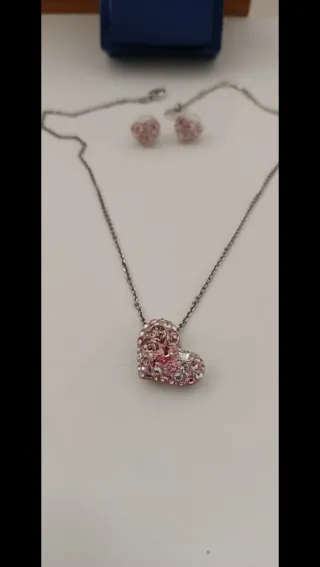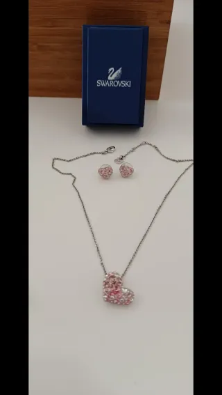 Precioso conjunto de joyería de Swarovski. - Collar con colgante de corazón. - Pendientes a juego con diseño de corazón. - Detalles en cristales rosas y plateados.