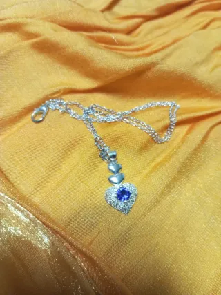 Elegante collar con colgante de corazón adornado con un zafiro azul central y circonitas. - Colgante con diseño de corazón. - Piedra central de zafiro azul. - Detalles de circonitas brillantes. - Cadena de plata.