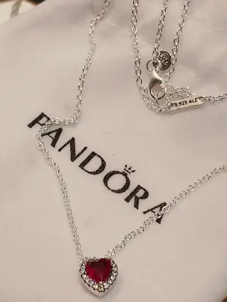 Elegante collar de Pandora con un colgante en forma de corazón. La pieza central es una gema de color rojo intenso, rodeada de pequeñas circonitas brillantes. - Colgante de corazón con gema roja. - Detalles de circonitas. - Cadena de plata de ley 925.