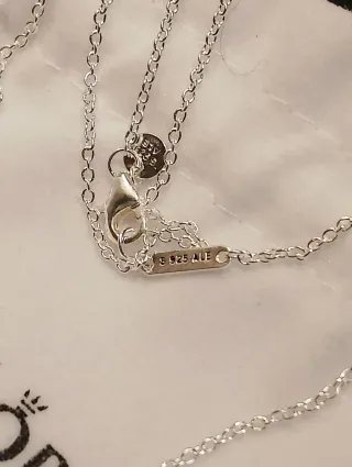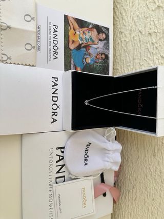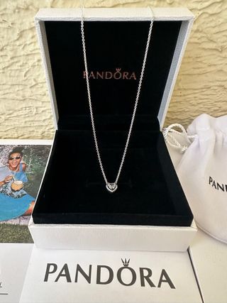 Elegante collar de la marca Pandora con un diseño de corazón. - Colgante en forma de corazón. - Cadena fina y delicada. - Acabado plateado. - Charm azul de regalo - Como nuevo