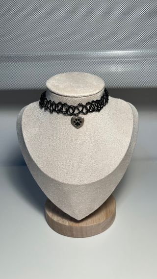 Collar tipo gargantilla elástico con un charm de corazón y huella. - Diseño de encaje negro. - Colgante metálico plateado en forma de corazón. - Detalle de huella de pata en el colgante.