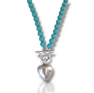 Elegante collar con cuentas de turquesa y un colgante de corazón. Material: Aleación de excelente calidad Acabado: Color plateado Cierre: T Lock Longitud: 45 cm Charm: 25*25 mm