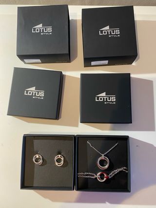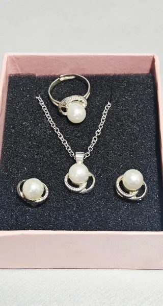 Conjunto fabricado en acero color plateado. Incluye collar, anillo y juego de pendientes. Diseño con perlas y detalles brillantes. Anillo medida ajustable. Se entrega en bolsita regalo. Sin estrenar.