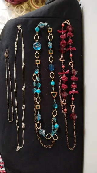 Lote de cuatro collares largos para mujer, con diseños variados y elegantes. - Un collar con cadena fina y detalles plateados. - Un collar largo con cuentas plateadas. - Un collar con cuentas y abalorios en tonos azules y dorados. - Un collar con detalles en forma de corazón y abalorios en tonos rojos y dorados.