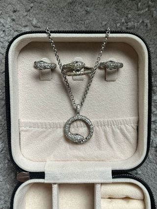Elegante conjunto de joyería de plata. - Diseño de serpiente con detalles brillantes. - Incluye collar con colgante, anillo y pendientes