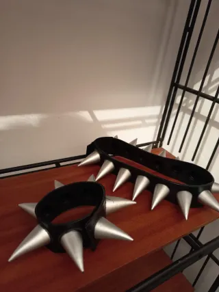 Set de accesorios punk para disfraces. Incluye brazalete con púas plateadas y collar con púas plateadas. Se enganchan con velcro. Prácticamente nuevos. SOLO se han usado 1 vez.