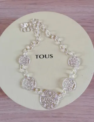 Elegante collar de la marca Tous. - Diseño circular con motivos florales. - Cadena fina. - Acabado plateado.