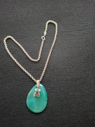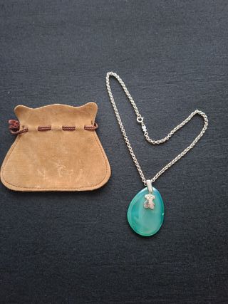 Cadena de plata eslabón rolo. Colgante estilo lágrima pulido de aventurina verde con el osito de TOUS delante en el engarce. Impecable estado de conservación. No tengo los embalajes pero lo entrego en una bolsita de ante de joyería. El colgante de aventurina es natural, la marca clara de delante es una inclusión (ver fotos) y la parte trasera tiene una zona hundida que es el inicio de la drusa de la piedra. No son defectos. Las medidas en las fotos. La cadena mide 40cm. El colgante mide 5cm x 3.5cm. Pesan 30gr. El modelo está descatalogado. Entrego revisado y limpio. Envío bien embalado.