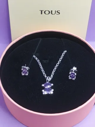 Conjunto de joyería Tous que incluye un collar con colgante y un par de pendientes. -Vienen en su caja original. - Diseño de oso. - Detalles en color morado. - Acabado plateado.