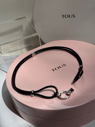 Collar choker tous combinado cordon piel negra , arandelas de cierre en plata 925 y dos motivos ,uno simbolo paz y el pasador de cierre oso plata 925 con espinelas negras. Largo total cordon negro de 41 cm. Arandelas plata de 1,3 x 2 cm. NO LO HE USADO. Esta nuevo. Lo entrego recien pulido en tous y con su caja tous. SW