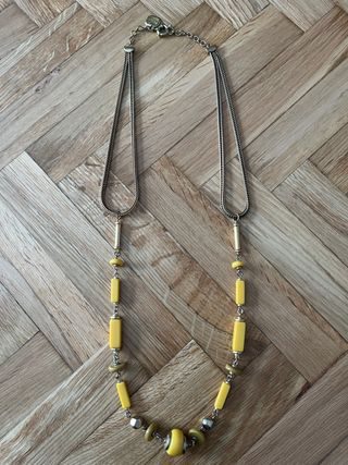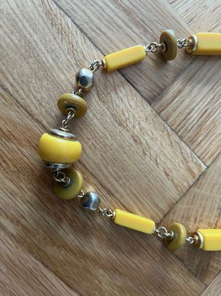 Bonito collar hecho a mano con un diseño único. - Colgante ovalado con detalles calados. - Piedras de colores incrustadas en el colgante. - Cuentas amarillas y plateadas. - Cierre de mosquetón.