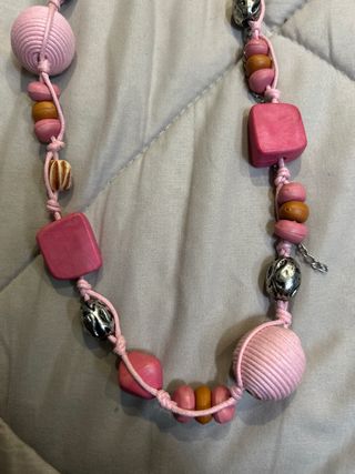 Collar llamativo con una variedad de cuentas. - Cuentas de diferentes formas y tamaños. - Diseño con cordón rosa y detalles plateados.