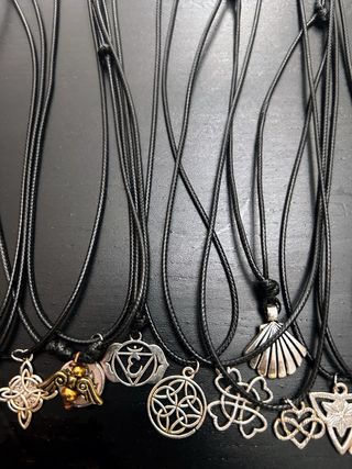 Collar de cuero negro con varios dijes plateados. - Diseño de concha marina. - Dijes con nudos celtas. - Dijes con forma de corazón. - Dijes con forma de mariposa. - Torre Eiffel. - Rueda ornamental.