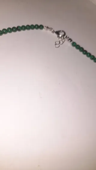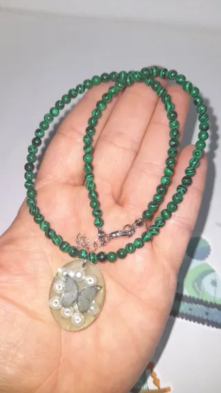 Elegante collar con cuentas verdes y un delicado colgante. - Cuentas de piedra natural. - Colgante ovalado con diseño de mariposa y perlas. - Cierre de mosquetón plateado.