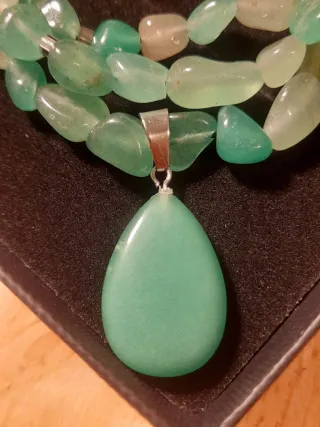 Elegante collar con colgante de piedra natural de aventurina verde. Las cuentas del collar son de diferentes tonos de verde y tienen una forma irregular y pulida. - Colgante en forma de lágrima. - Cuentas de aventurina pulida. - Cierre de metal plateado.