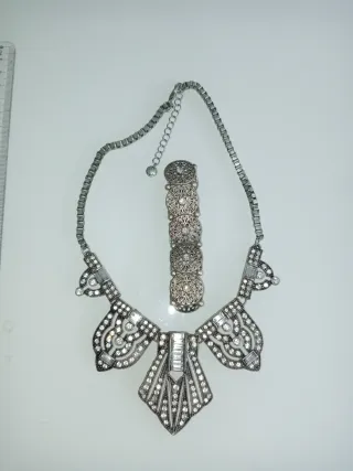 Conjunto de bisutería plateada que incluye un collar y una pulsera. - Diseño detallado con pedrería. - Estilo vintage. - Cierre ajustable en el collar. Más productos muy interesantes en mi perfil.