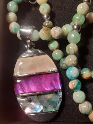 Collar con cuentas de piedra natural y un colgante ovalado con incrustaciones. - Cuentas de piedra en tonos verdes y marrones. - Colgante con capas de nácar y abulón. - Cierre de cadena plateada.
