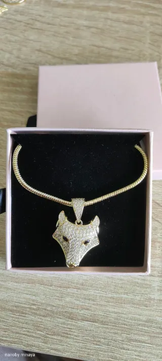 Elegante collar con un llamativo colgante en forma de cabeza de zorro, adornado con incrustaciones brillantes. - Diseño detallado de zorro. - Cadena dorada. - Colgante con múltiples cristales.