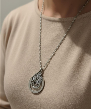Elegante collar con un diseño llamativo. - Cadena de eslabones plateados. - Colgante central con forma de flor. - Detalles en relieve en el colgante.
