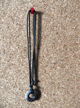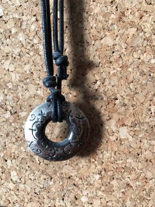 Collar con un diseño circular y cordón ajustable. - Colgante de estilo menorquín. - Grabados detallados en el colgante. - Cordón negro. - Cierre con nudos ajustables.