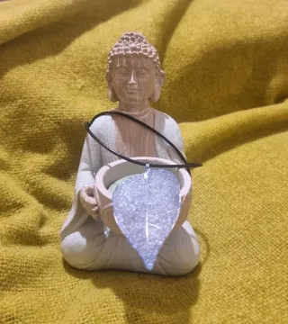 Collar con colgante en forma de hoja, con un diseño delicado y brillante. - Colgante con forma de hoja. - Acabado plateado con detalles. - Cordón negro para colgar.