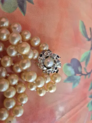 Elegante collar de perlas cultivadas de dos vueltas, con un estilo inspirado en la década de 1920. El cierre es un detalle de pedrería. - Perlas de color beige. - Cierre plateado con pedrería. Las perlas tienen un color dorado/amarillo cálido,a que que son perlas naturales o cultivadas de los Mares del Sur. -Cierre: El broche es una pieza central destacada con un diseño de racimo de flores. Le faltan piedras. -Se salta la pintura de la perlas. -Tacto frío, no son imitación.