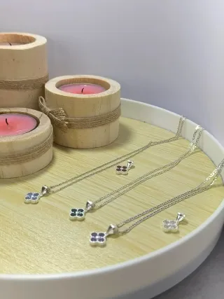 Elegante conjunto de collar y pendientes. - Fabricado en plata 925. - Diseño de tréboles con incrustaciones verdes. - Piedra preciosa Nácar. - Cierre de mariposa en los pendientes.