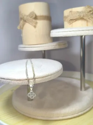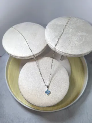 Elegante collar con un colgante de plata 925. El diseño del colgante es un trébol o flor con pequeñas piedras azules. - Material: Plata de Ley 925. - Diseño: Colgante tipo trébol/flor. - Detalle: Piedras de color azul.